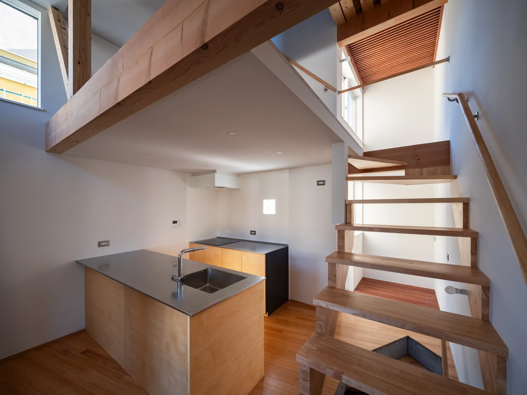 緑の家用途専用住宅敷地面積49.59㎡建築面積24.70㎡延床面積69.65㎡建物高さ9,865mm竣工2025年1月建築設計青木真研究室 / 青木真構造設計山辺構造設計事務所 / 山辺豊彦 馬場淳一施工栄伸建設 / 榎本健二