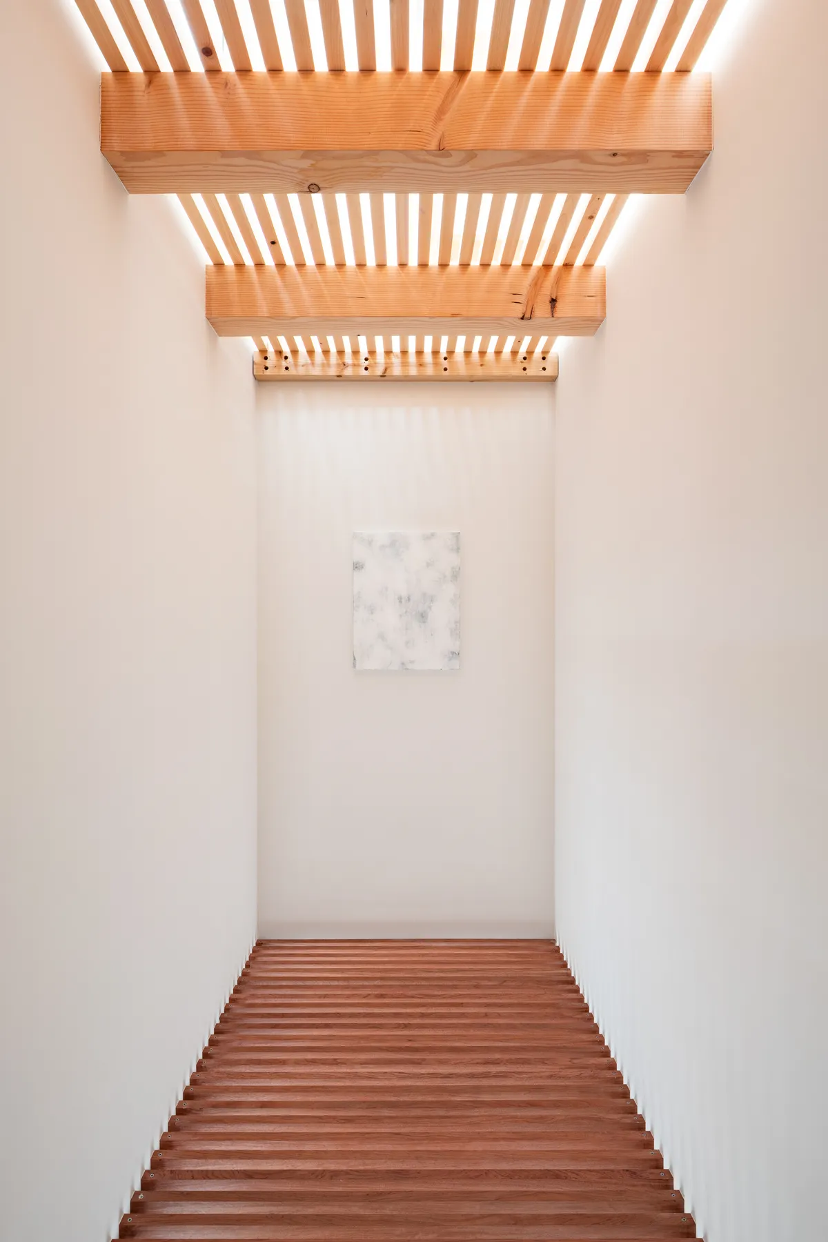 Inside, a single continuous room is composed of small niches that connect three-dimensionally. Windows placed at different orientations and heights draw in natural light that changes with the seasons and throughout the day.