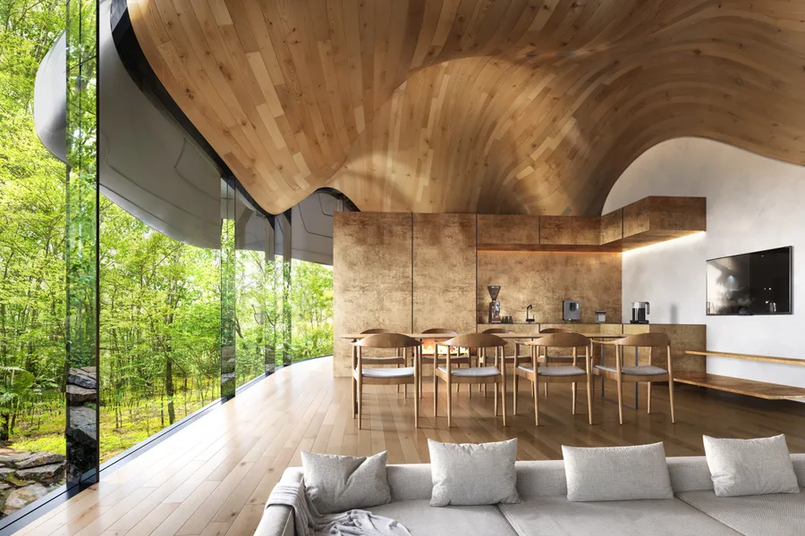 NOT A HOTEL design competition proposalNOT A HOTEL デザインコンペティション応募案UseVillaArea213㎡LocationKaruizawaDesignShin AokiCGMana Visual用途ホテル・別荘面積213㎡場所軽井沢設計青木真CGMana Visual<p>The appeal of Kita-Karuizawa’s natural landscape lies in the rugged rock surfaces beneath and the lush, green canopy above. Suspended midway in this richly layered vertical scenery, we introduced an artificial cloud. This cloud subtly reflects the surrounding nature and continually changes its appearance with the seasons, weather, and movement of people. By implying the deep human desire to comfortably enjoy nature, we aimed to create an experience that is uniquely rooted in this specific natural environment.</p><p>北軽井沢の自然の魅力は、足元の荒々しい岩肌と、上空の緑豊かな樹冠である。</p><p>この垂直方向に豊かな起伏のある風景の中ごろに、人工の雲を浮かべる。雲は周囲の自然をわずかに映しながら、四季や天気、人の動きによってその表情を刻一刻と変えていく。</p><p>快適に自然を楽しむという、ある種最も人間的な欲求を可視化しつつ、そこにしかない自然の体験を生み出すことを試みた。</p>[]NewAns Shinjuku